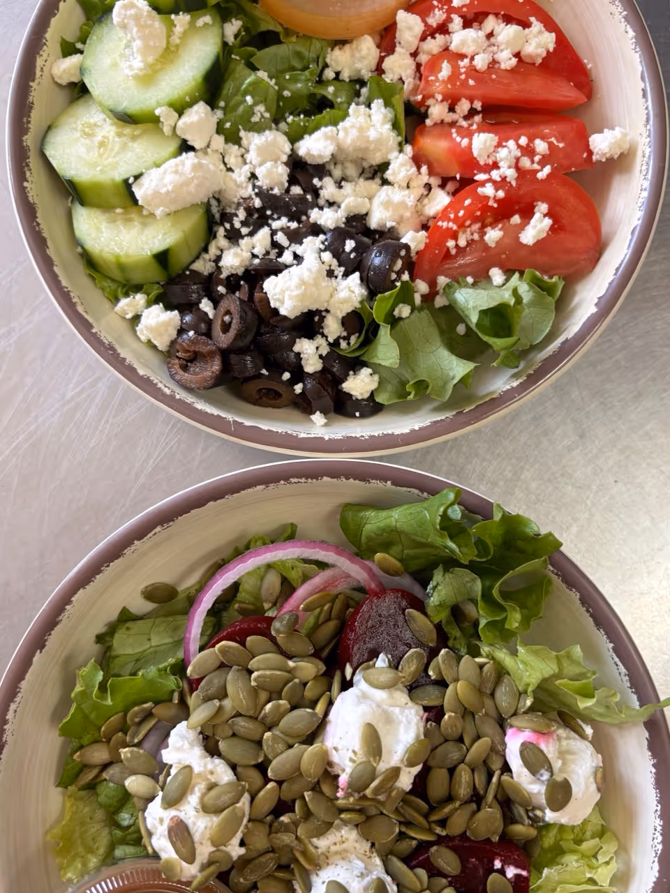 Green leaf lettuce, beets, goat cheese, pepitas, red onion, and balsamic vinaigrette on the side.